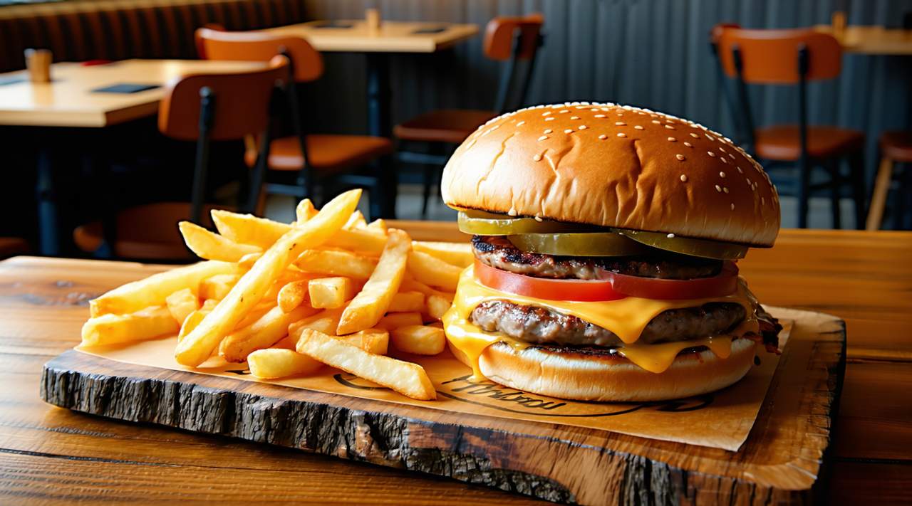 180gr Carne de ternera, lechuga, tomate, cebolla, queso cheddar, papas pajas, salsas (kétchup, mayonesa y mostaza)
