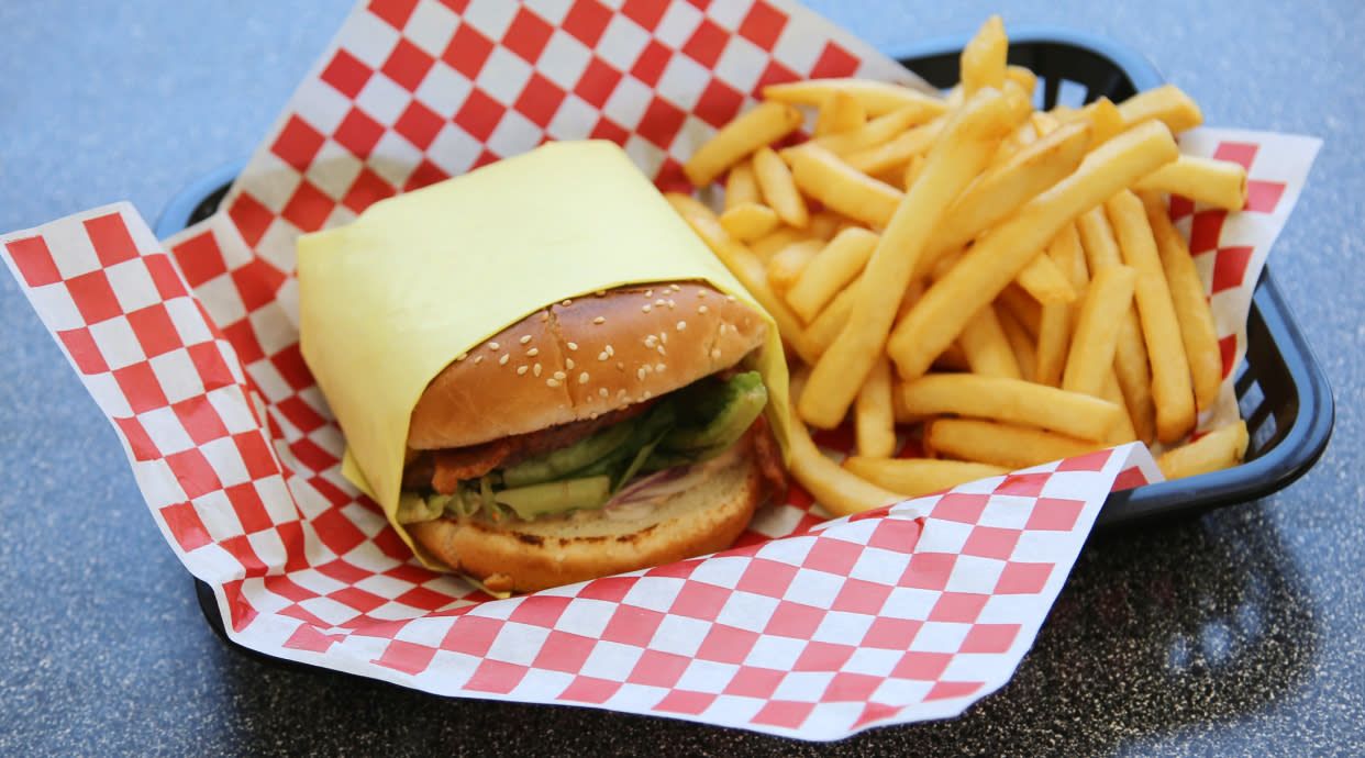 Hamburguesa de carne de ternera (100 g.) o pollo a elección, mix de ensalada rallada de repollo con zanahoria, lechuga, tomate, patatas fritas paja dentro, jamón, queso amarillo y 1 salsa de la casa a elección Con patatas fritas y bebida a elección