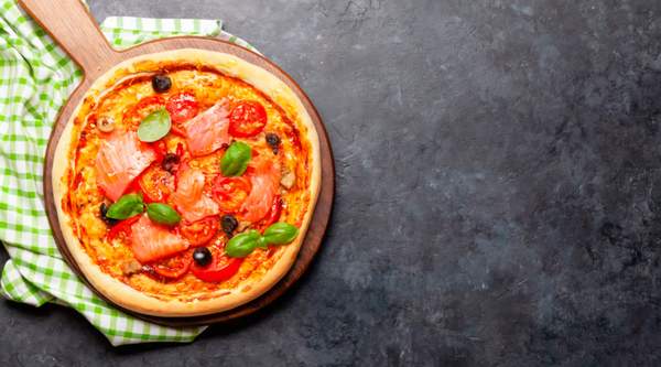 Masa fresca, salsa de tomate, 100 % mozzarella, salami, beicon, champiñones y extra de queso