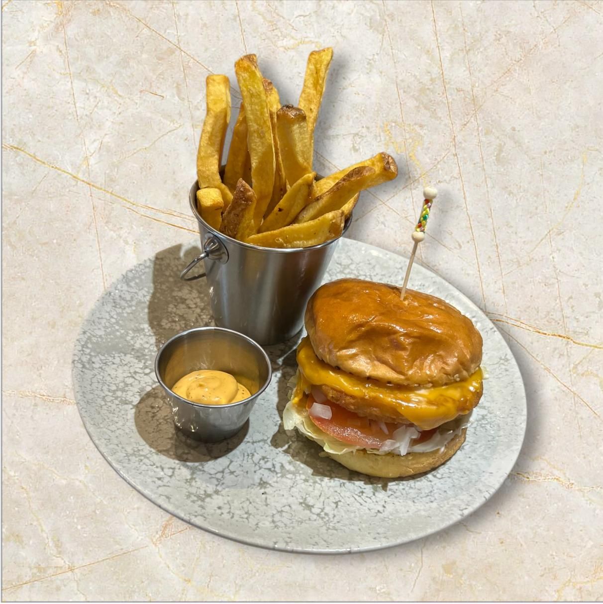 Salsa cheddar, con patatas fritas y tenders de pollo.