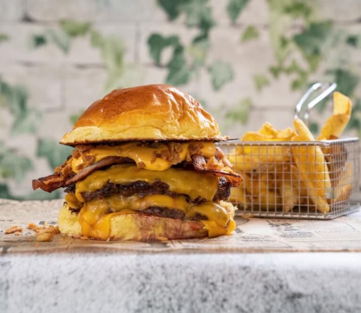 Un burger de nivel supremo que te dejará huella. Con doble lámina de carne de vaca madurada (2×140gr), triple cheddar, doble bacon ahumado crujiente, salsa cheddar y cebolla crispy.