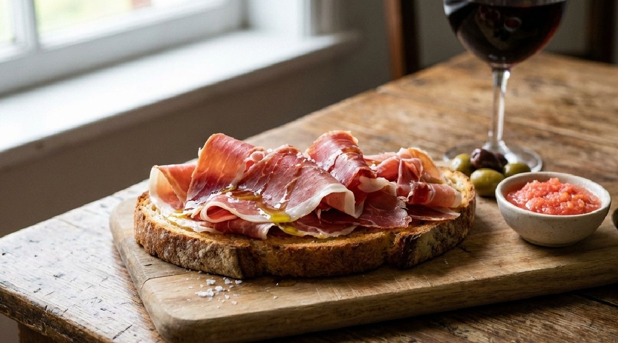 Combinación de tomate natural y jamón serrano sobre pan tostado.