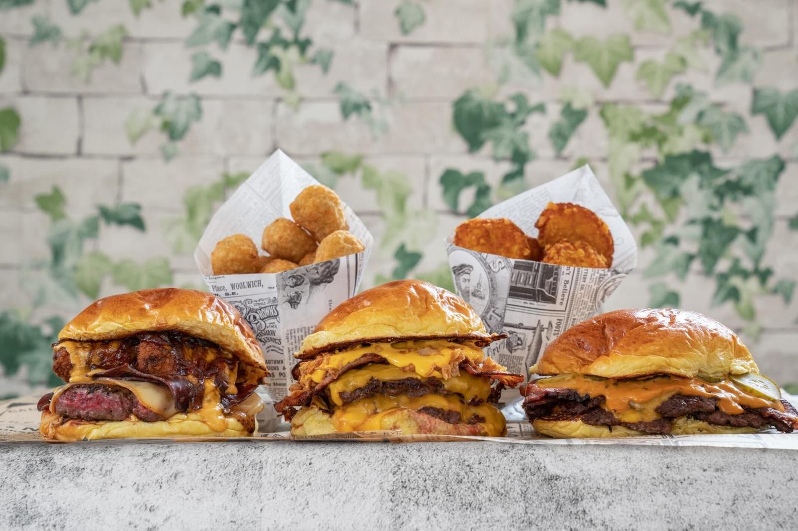3 láminas de vacuno (80 g.) con costrita dorada por fuera y jugosas por dentro, cebolla plancha, triple cheddar rojo, bacon natural ahumado en leña de haya, salsa de jalapeño asado picante. Todo ello coronado con el pan brioche del mercado