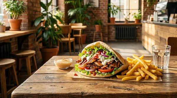 Pan, ternera y pollo, ensalada, salsa de yogurt y queso de oveja