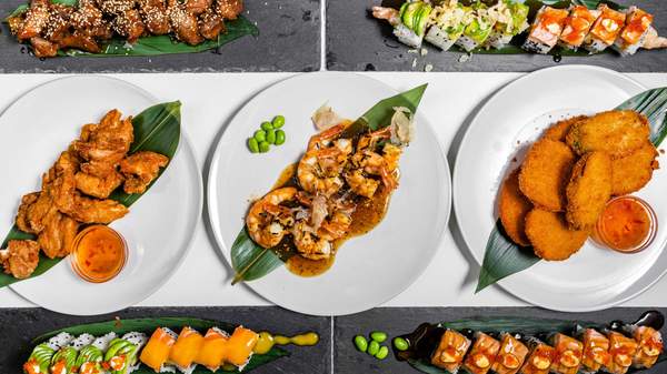 1 mister roll, 1 sushi Ebi, 1 sushi salmón flameado, 1 sushi anguila, 1 sushi pez mantequilla flameado