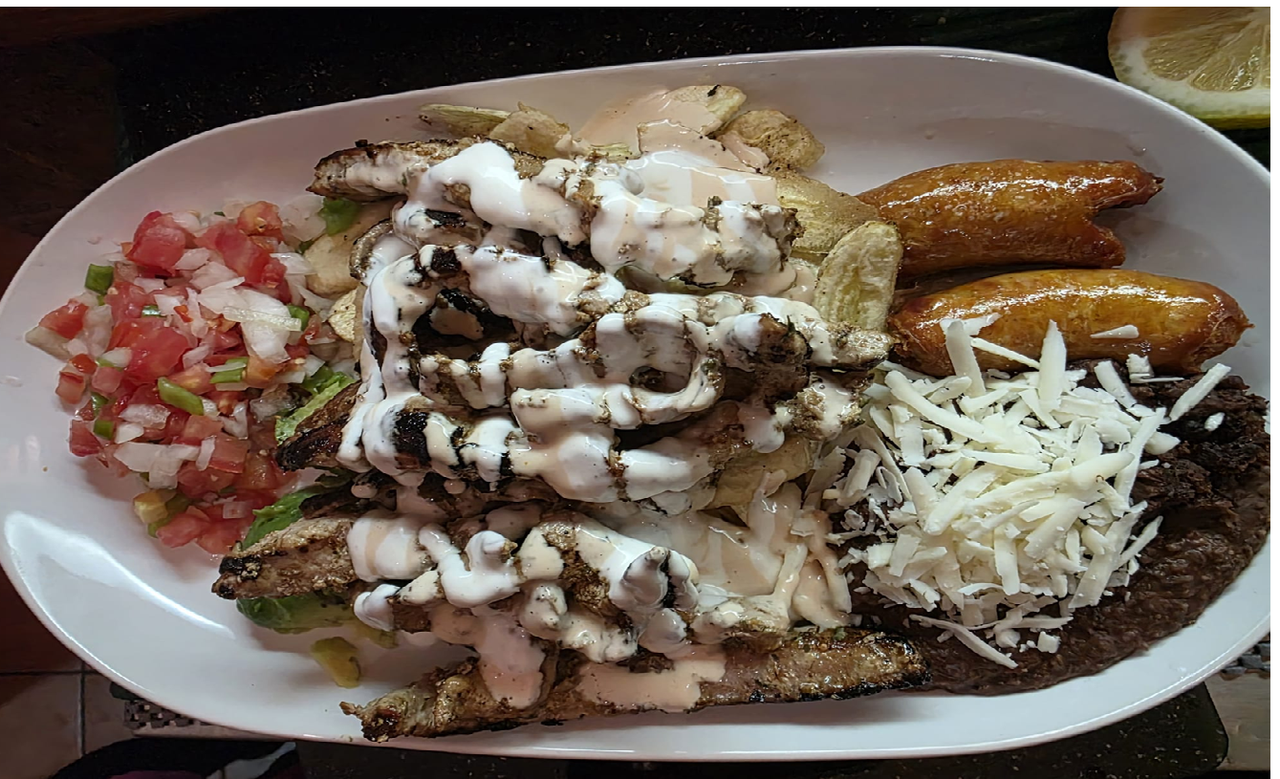 Cena tradicional Hondureña, frijoles fritos, aguacate, chorizo,platano maduro fritos, huevo,tortilla, queso mantequilla salchicha
