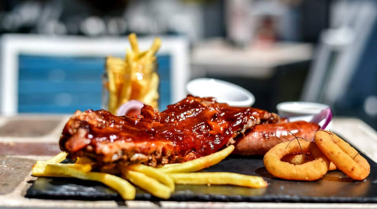 Carne de Lomo alto de rubia gallega (200 g.), con queso provolone a la plancha, bacon crujiente, aros de cebolla frita, rúcula y salsa de la casa