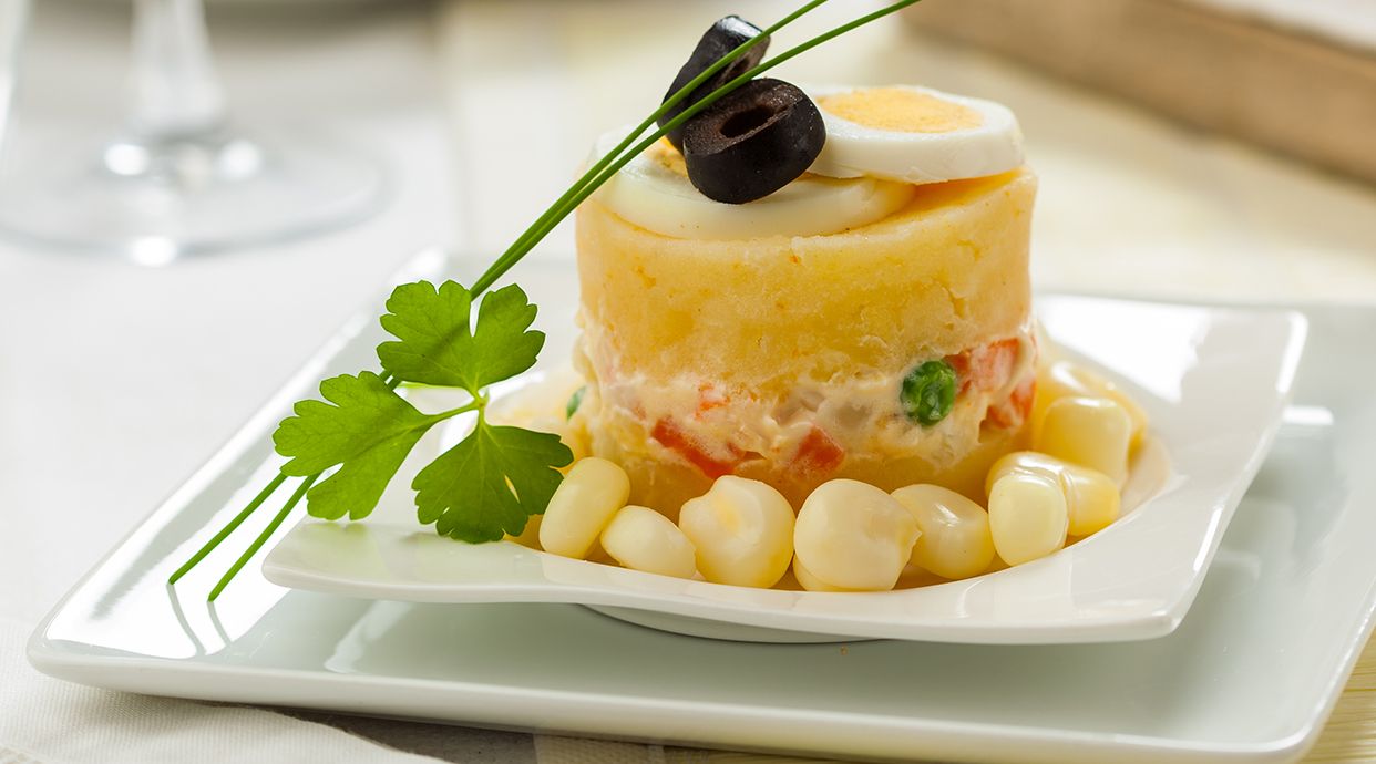 Un entrante tradicional. Patatas cocidas en especias tradicionales, amasadas y rellenas de pollo, mayonesa y vegetales