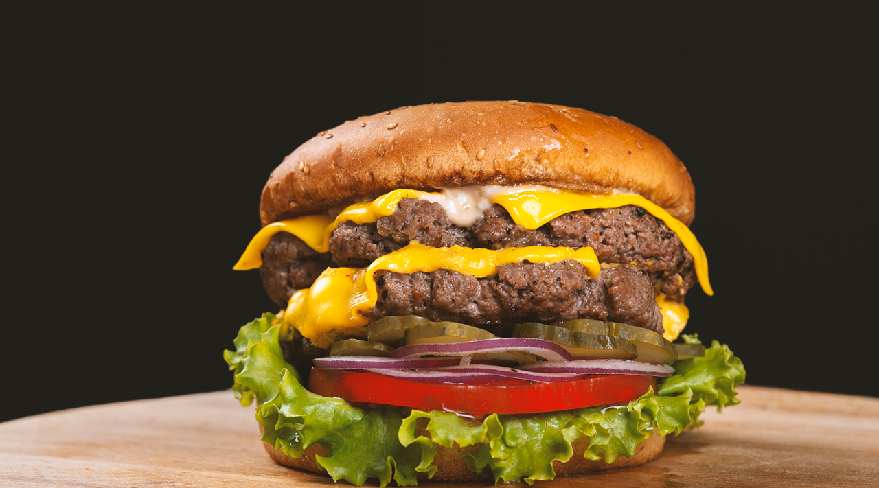 Carne premium, pan brioche, doble queso cheddar, cebolla caramelizada, patatas paja, huevo, bacon, salsa de trufa, kétchup y mayonesa. Con lechuga, tomate, pepinillos y ración de patatas fritas
