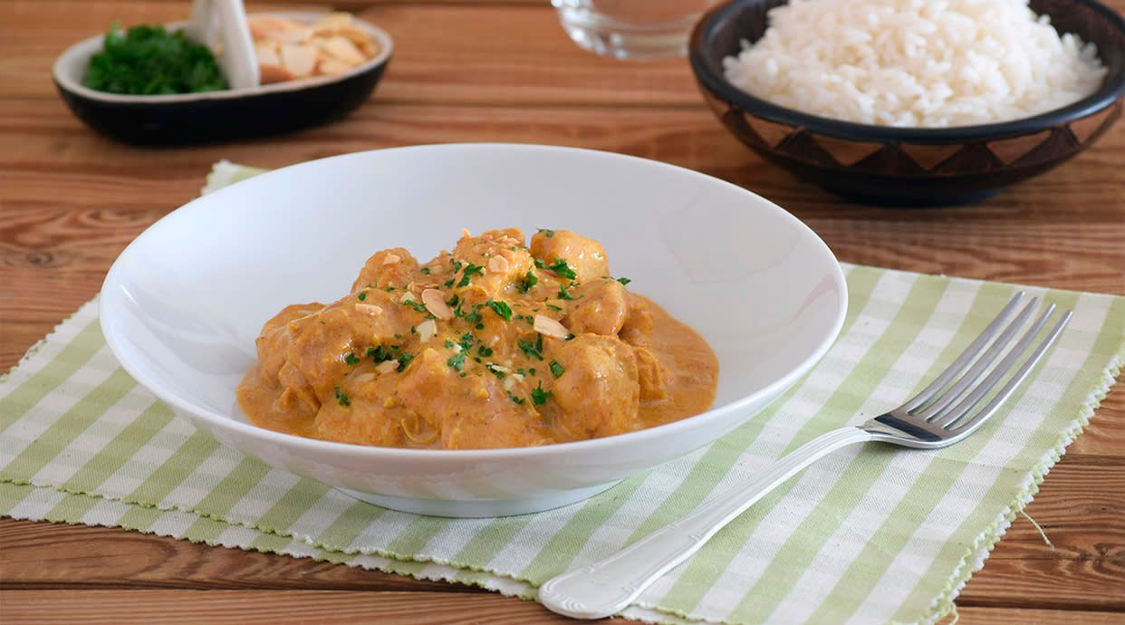 Suave curry de pollo tikka en salsa de frutos secos, azafran y cerna