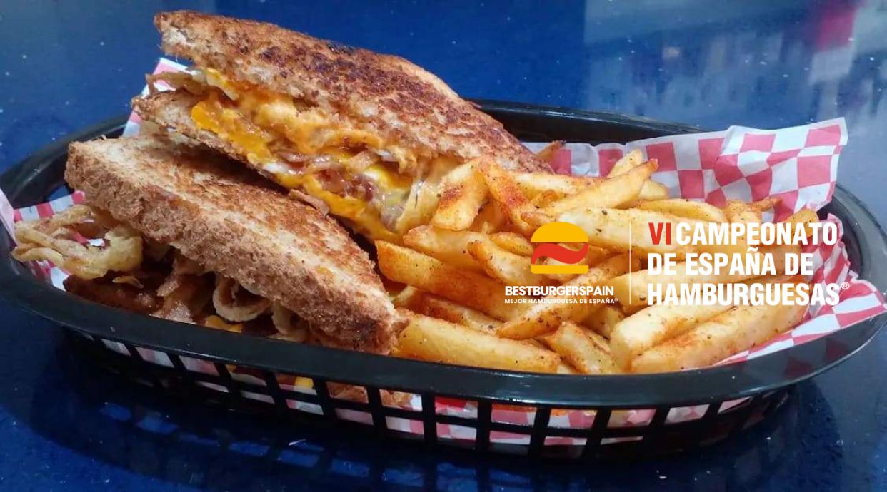 Sandwich a la plancha con bacon cebolla frita crujiente, queso cheddar, huevo a la plancha y salsa miel mostaza