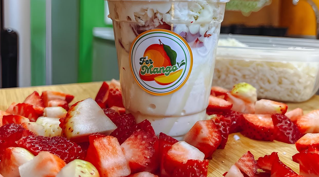 Granizado de fresa mango, mix de frutas (manzana, banana, mango, piña y uva) con leche condensada, sirope de fresa y Milo.