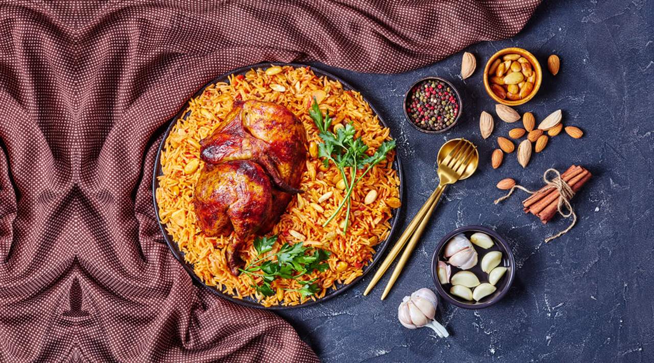 Arroz basmati especiado con taquitos de pollo tikka, cordero, gambas y verduras