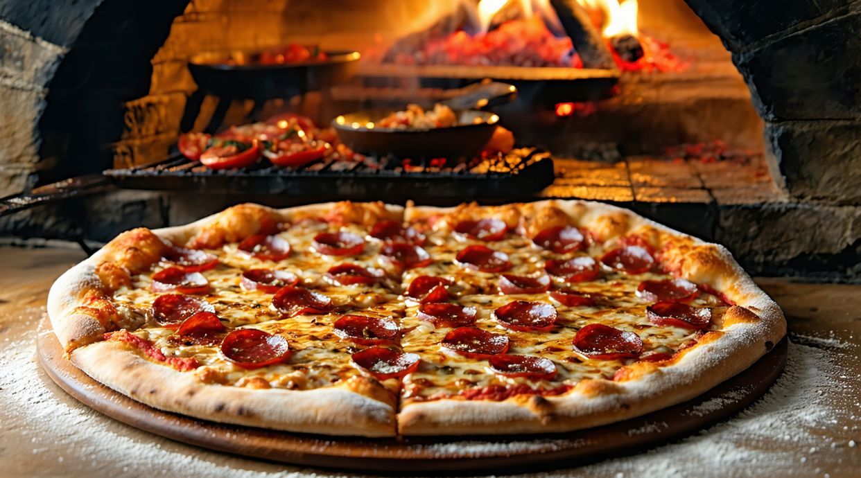 Salsa de tomate, mozzarella, setas horneadas, cebolla, maíz, jamón york, bacon y nata
