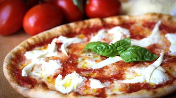 Pizza de pesto, tomates cherry y mozzarella de búfala fresca