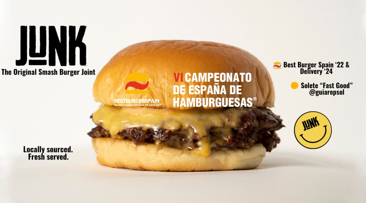 LA MEJOR HAMBURGUESA DE ESPAÑA 2022. Doble Smash Burger de vaca avileña. Acompañada de queso cheddar y crujiente bacon ahumado. Salsa secreta. Envuelta en nuestro pan brioche con pepitas.
