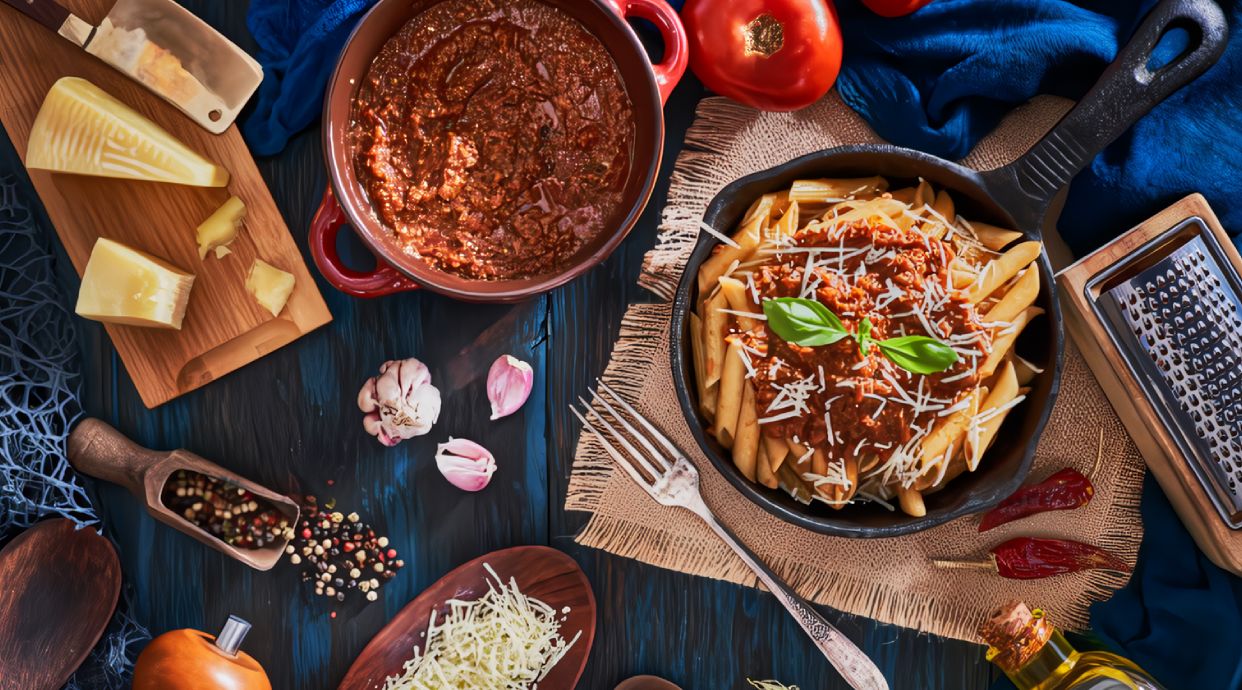 Pasta con auténtica salsa boloñesa siguiendo la receta italiana tradicional, cocinada a fuego lento para un sabor profundo