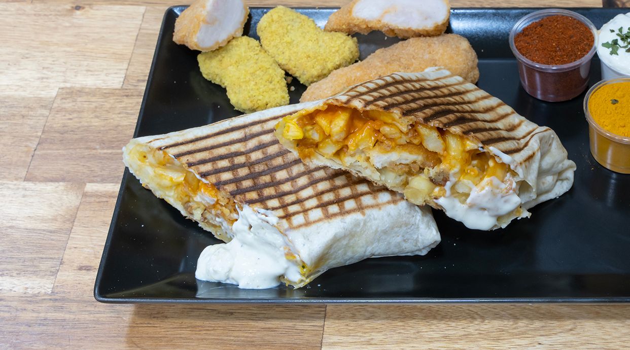 Falafel, lechuga, tomate, cebolla, maíz, patatas fritas, queso, salsa de queso