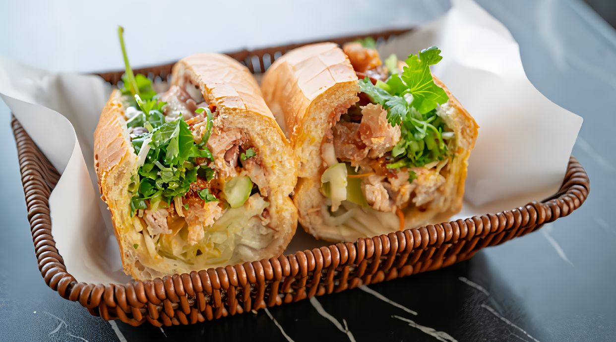 Banh mi crujiente con paté de hígado de cerdo, embutido vietnamita, ruốc de cerdo, zanahoria y rábano encurtidos, cilantro, pepino y salsa especial.