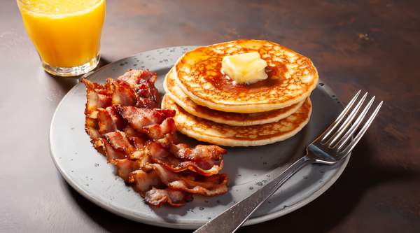 Cuatro tortitas americanas acompañadas de bacon , huevo revuelto y sirope de arce.