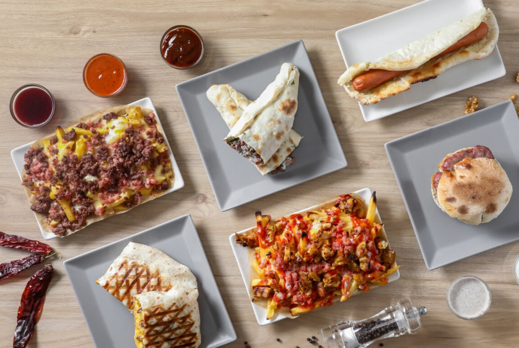Masa casera, ternera a la brasa, cebolla, perejil, tomate, salsa mojo y salsa yogurt