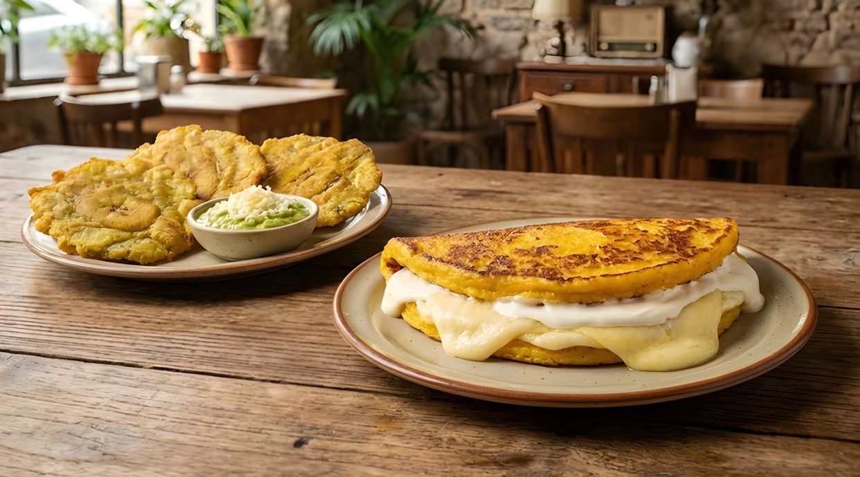 Pan redondo de maíz blanco de 12 CMS , a la plancha y relleno de carne desmechada, alubias negras, plátano macho maduro y queso blanco rallado.