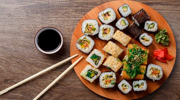 8 makis de salmón, 8 makis de atún, 8 uramakis de pollo, 5 futomakis de salmón y aguacate, 2 nigiris de salmón, 2 nigiris de atún, 2 nigiris de gamba, 2 nigiris de pez mantequilla