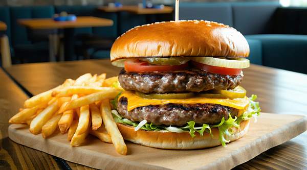 Clásica hamburguesa de carne picada de ternera, servida en pan y acompañada de lechuga, tomate y cebolla