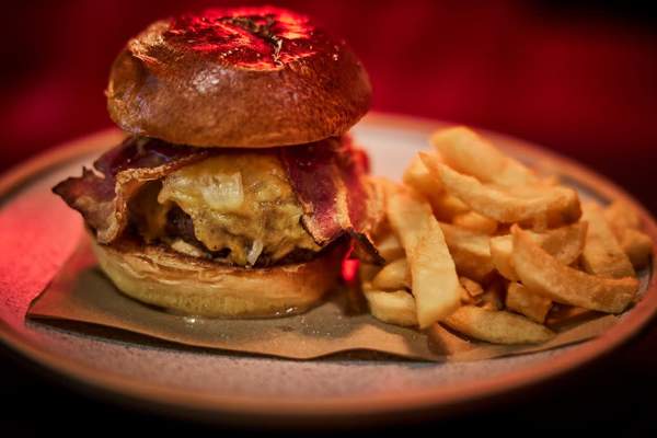 180 gr de carne madurada, salsa bourbon, pepinillos encurtidos caseros, cheedar ahumado, cebolla pochada, bacon ahumado, cebolla crujiente y bbq de chipotle en pan potato roll.