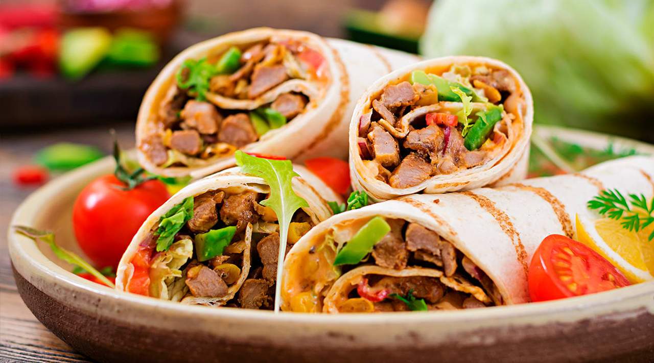 Envuelto relleno de ternera, pollo o carne Molcajete con pico de gallo, frijol refrito, aguacate y queso cheddar