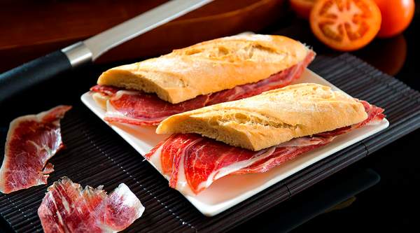Bocata planchado de jamón serrano con tomate a rodajas, aceite de oliva, sal y orégano