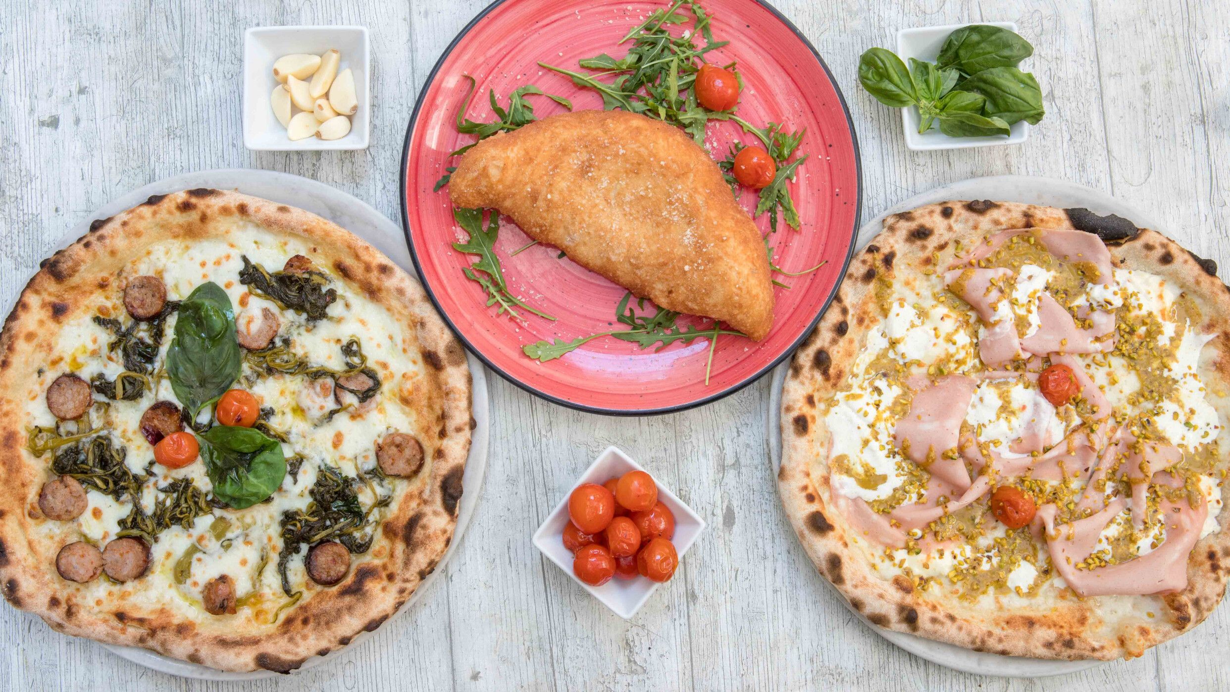 Base blanca de mozzarella fior di latte, friarielli (acelga típica napolitana) y salchicha fresca