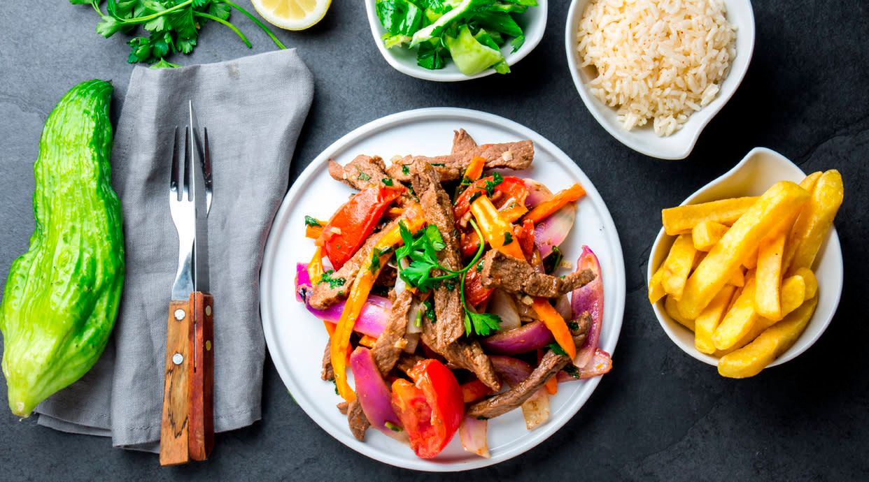 Conlleva arroz, patata, carne de ternera, viene acompañado aparte con huevo frito y curtido de ensalada de tomate, cebolla y cilantro.