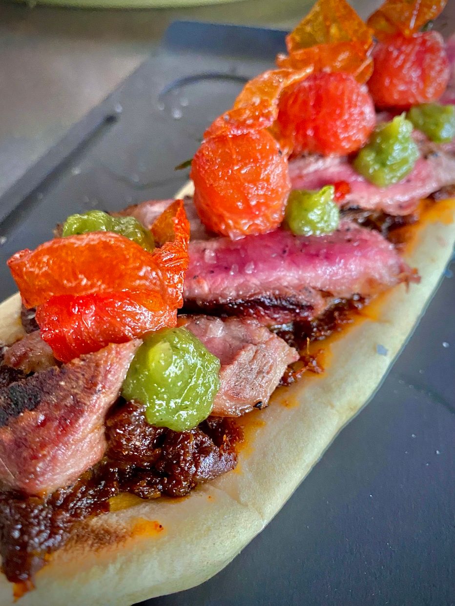 Solomillo de cerdo a la brasa con jamón ibérico, mermelada de bacon y pimientos del padrón. Alérgenos: Gluten