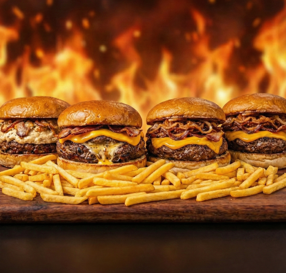 Hamburguesa de 250gr. 100% premium con ternera del bierzo rellena de bacon ahumado caramelizado,cebolla dulce caramelizada con toque de queso gorgonzola, queso cheddar, salsa de la casa, elaborada a mano pan brioche, con patatas fritas y bebida de 330 ml.