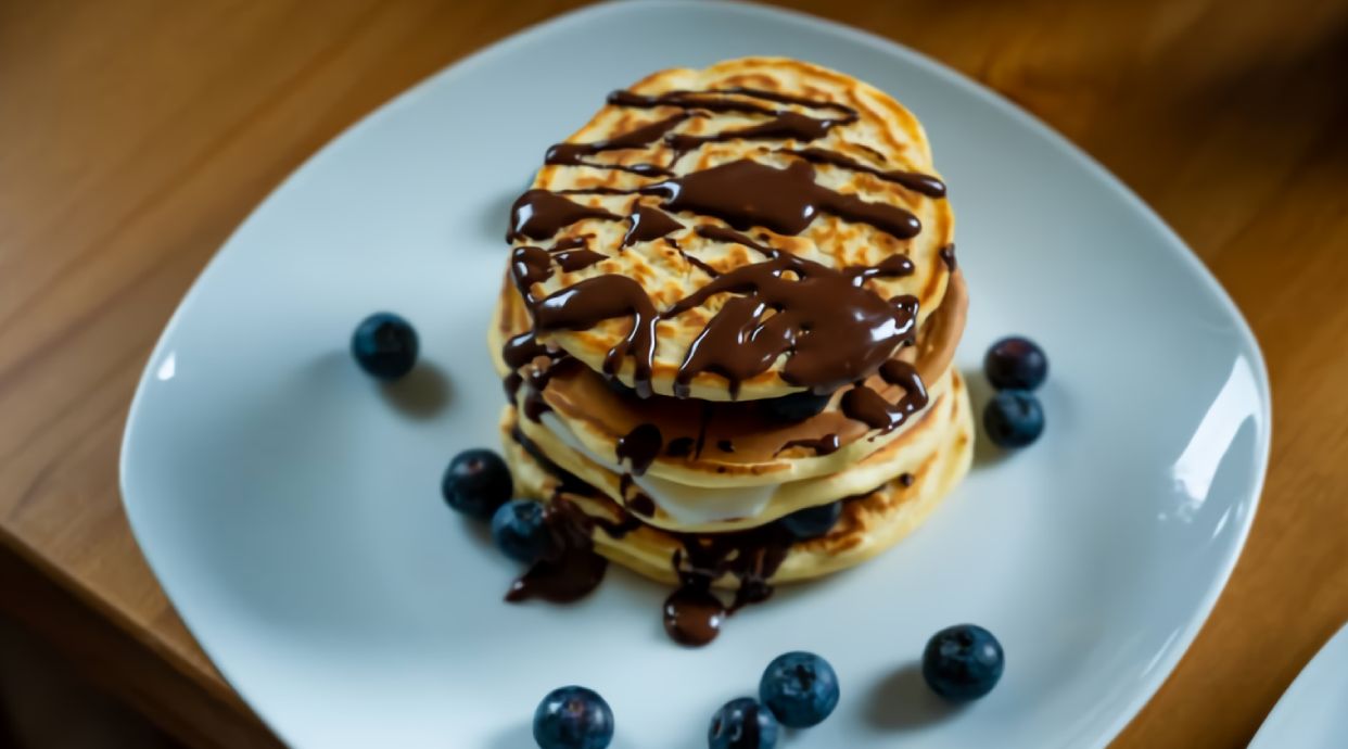 Tortitas, crema mascarpone y frutos rojos y virutas de cacao