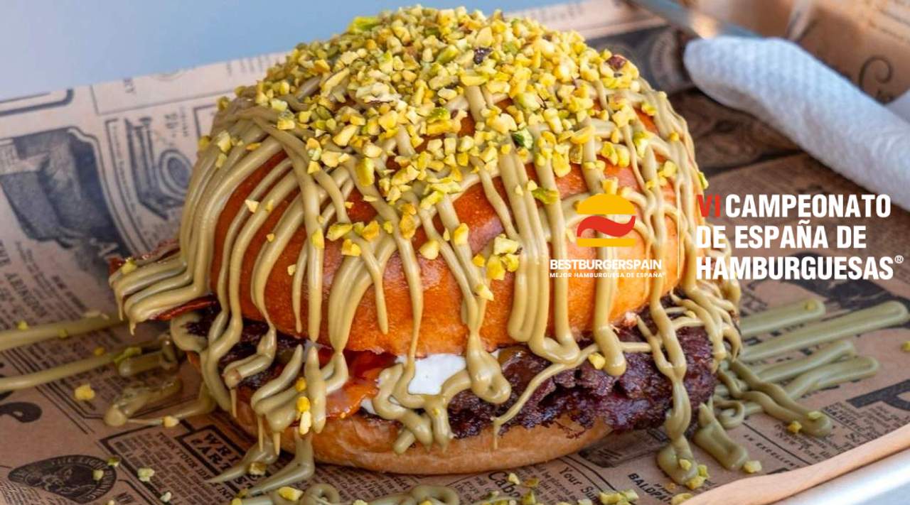 Doble pattie (90 g.) de carne de angus, doble de bacon ahumado crispy, doble queso cheddar fundido, burrata, salsa de pistacho y grano de pistacho