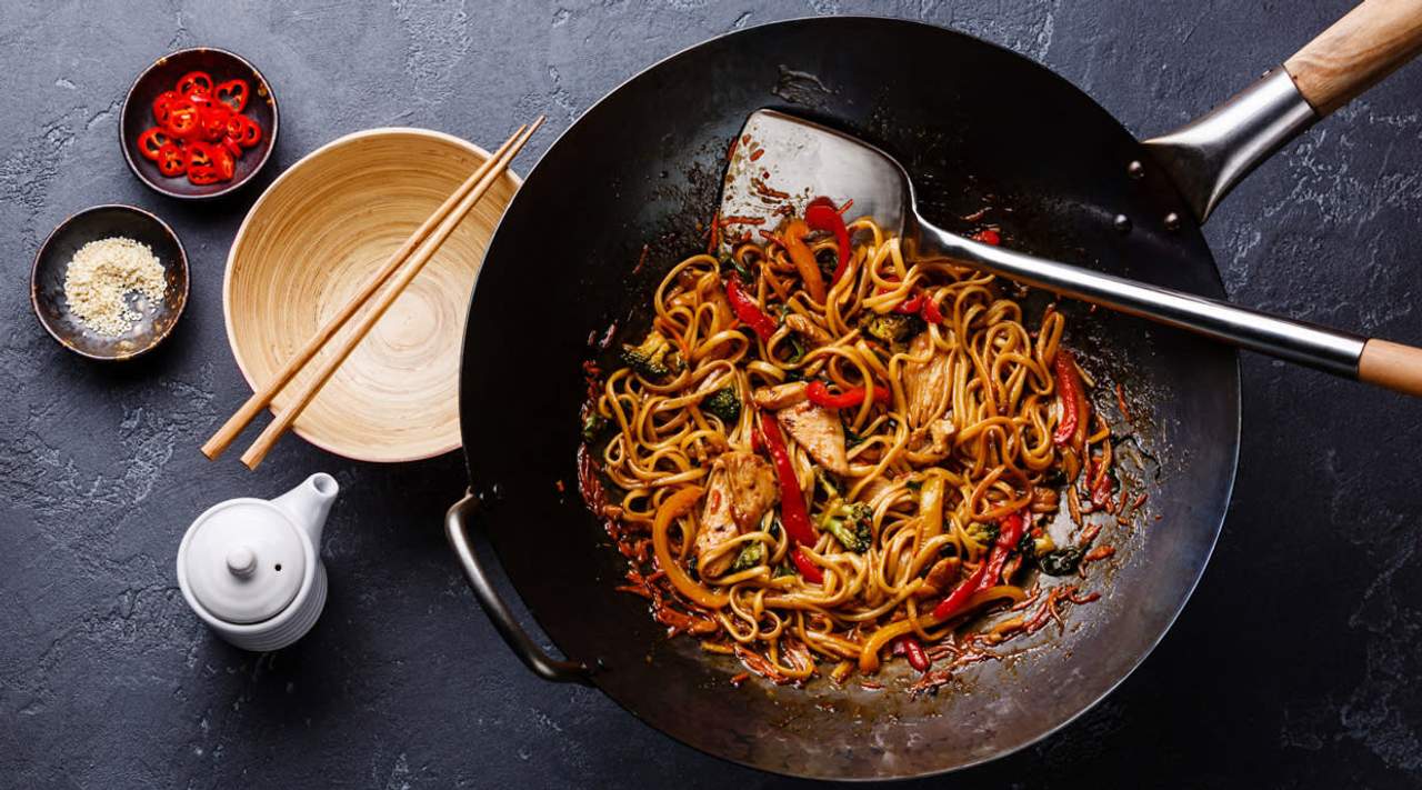 Carne, champiñones, fideos, brotes de soja, cebollas verdes y rábanos