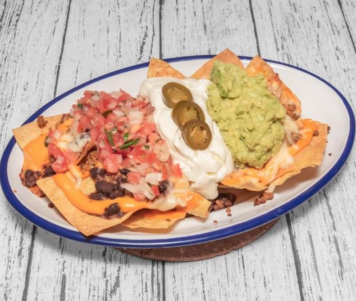 Nachos caseros, acompañados de carne, frijoles, queso cheddar y queso gratinado. Coronados con guacamole, crema agria, ensalada bandera y jalapeños