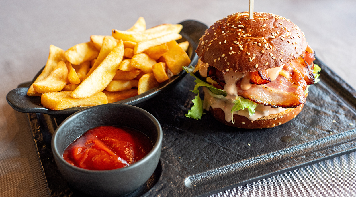 Filete de heura acompañado de tomate, pepinillos, lechuga, cebolla y Vacon, aderezada con nuestra salsa rosa espaciada y un toque de mostaza. Con patatas fritas