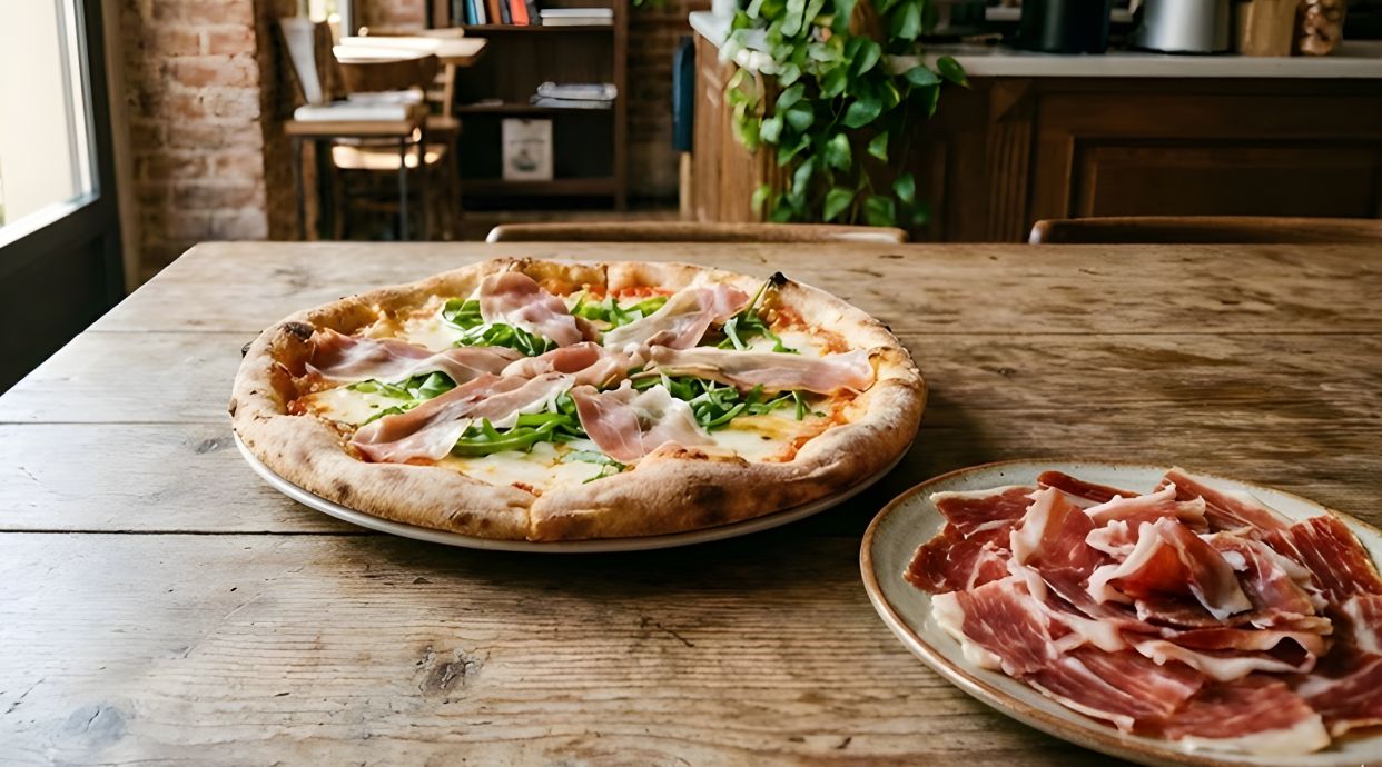 Salsa de tomate, mozzarella, jamon serrano,rucula, parmigiano, tomate cherry