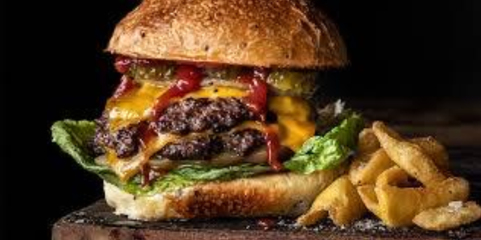 100% Americana, doble cheddar, doble bacon, cebolla, lechuga, tomate y pepinillo