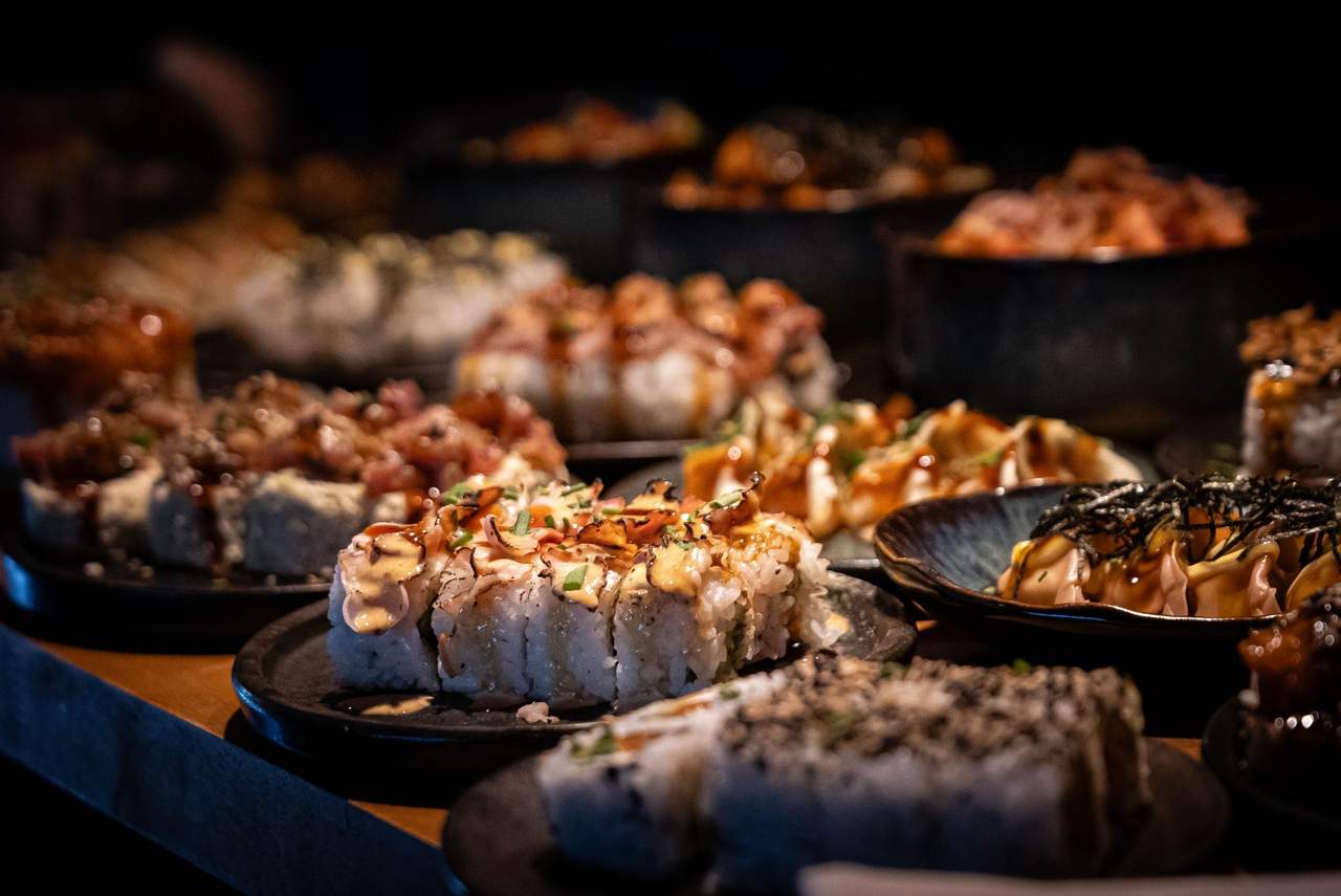 Atún bluefin, aguacate, queso crema, cubierto de fresa caramelizada y un toque de polvos picantes