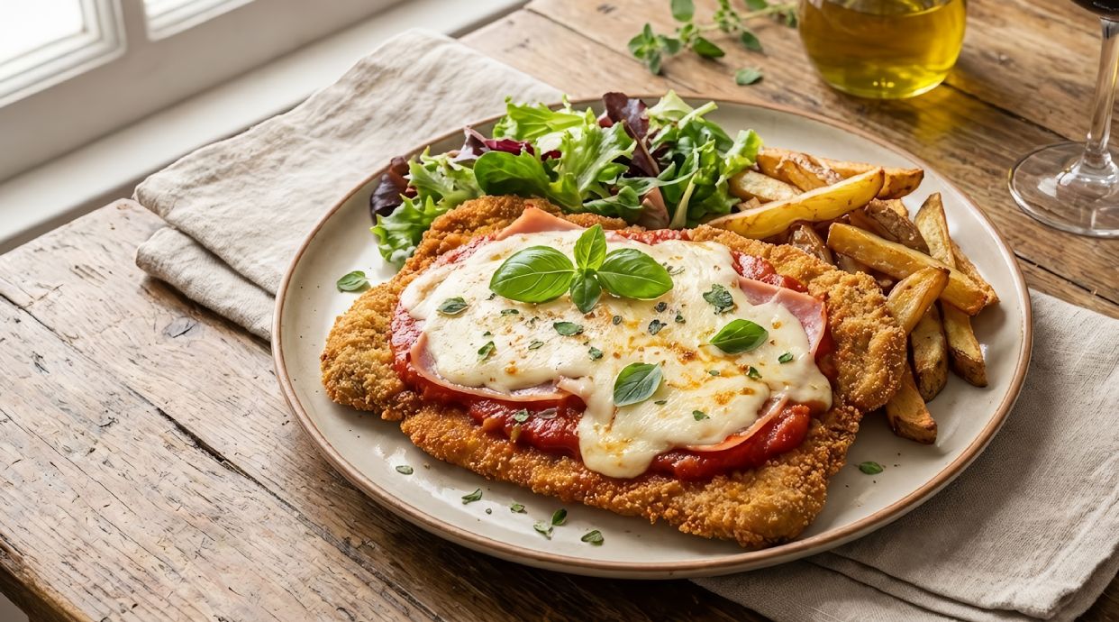 Dos huevos fritos sobre una cama de patatas, coronados con jamón serrano