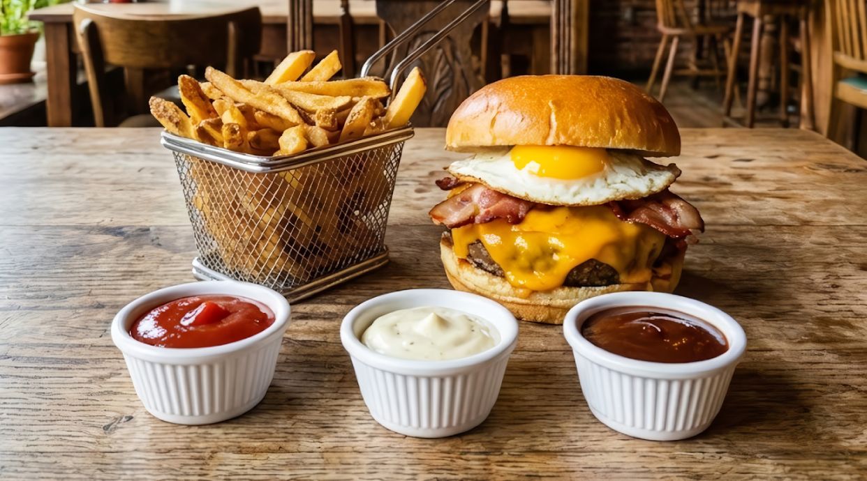 Pan, pollo crujiente, salsa burger, tomate, lechuga, queso y cebolla caramelizada