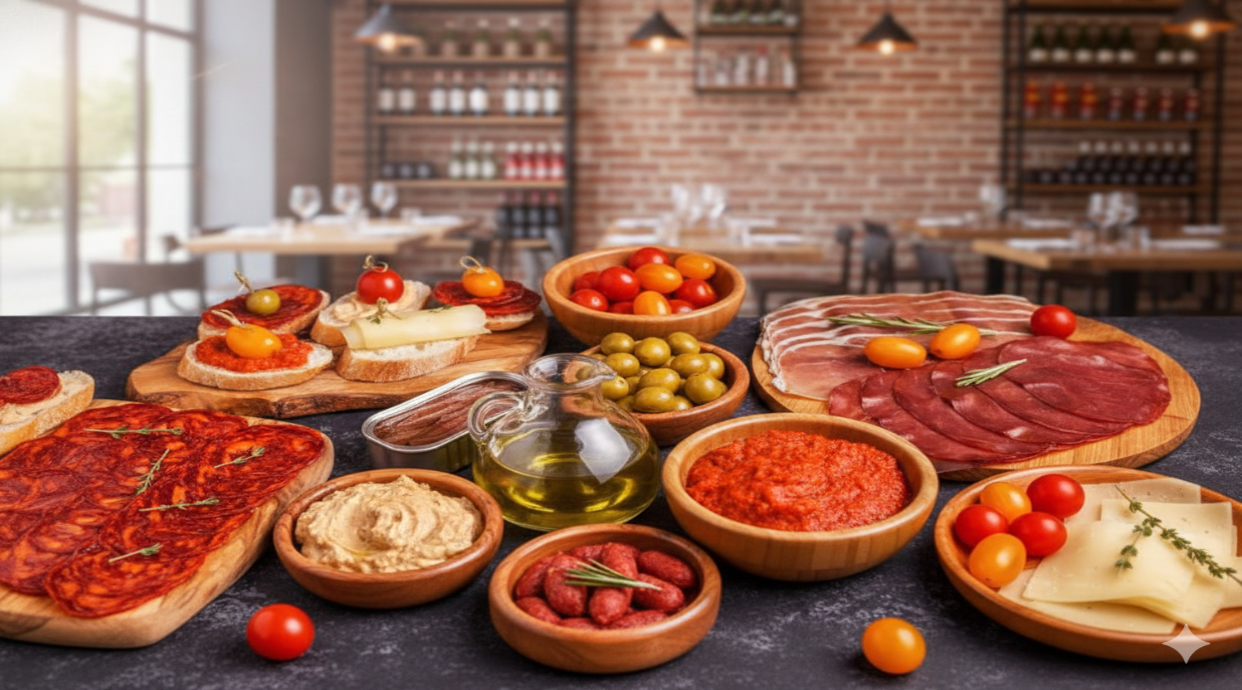 Clásico jamón ibérico sobre jugoso tomate, auténtico y fresco