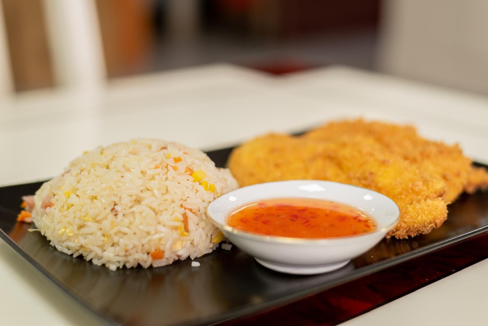 Esta es nuestra combinacion preferida porque es crujiente y tierno al mismo tiempo. Arroz con huevo, Crispy Happiness y Pollo Teriyaki.