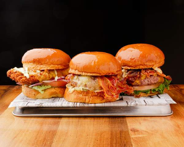 Crujiente aro de cebolla a la cerveza, bañado con nuestra salsa secreta a base de bourbon, 160g de nuestro blend de Black Angus y vaca vieja madurada, bacon crujiente, queso cheddar fundido y lechuga.