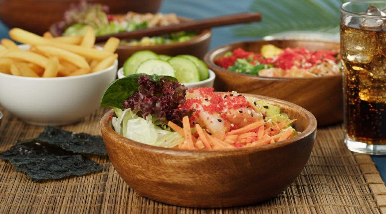 Arroz, aguacate, pepino, mango, alga wakame, cherries, chia y spaicy sauce