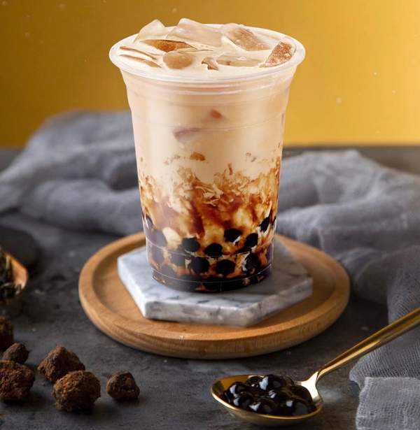 Te negro con leche y incluye de topping pudín de hierba y mango más perla tapioca